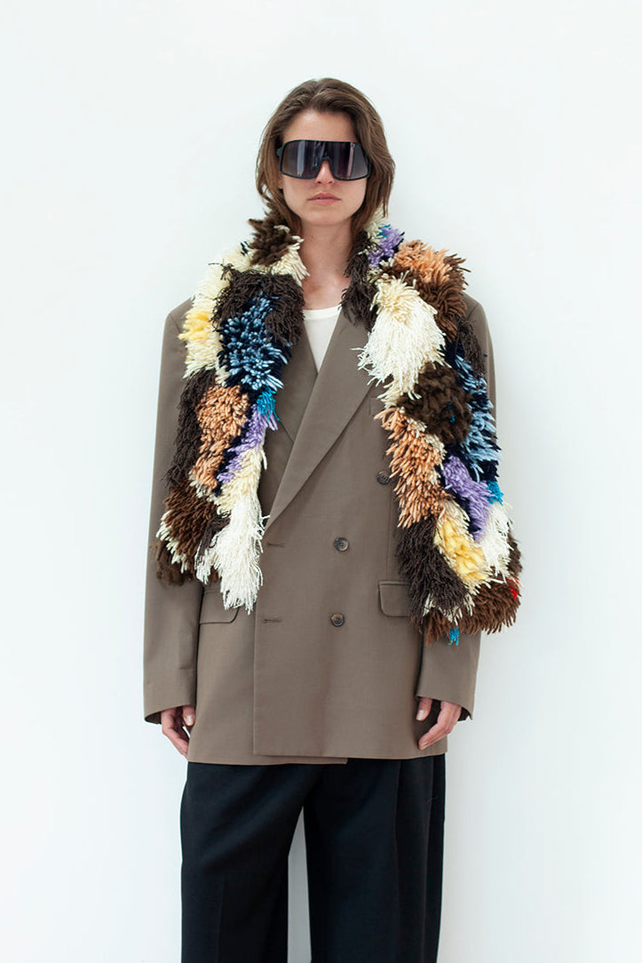 The fur-stitch knit is tactile, sculptural, contemporary. Graphic yet soft in hand. Art-inspired yet grounded in function.