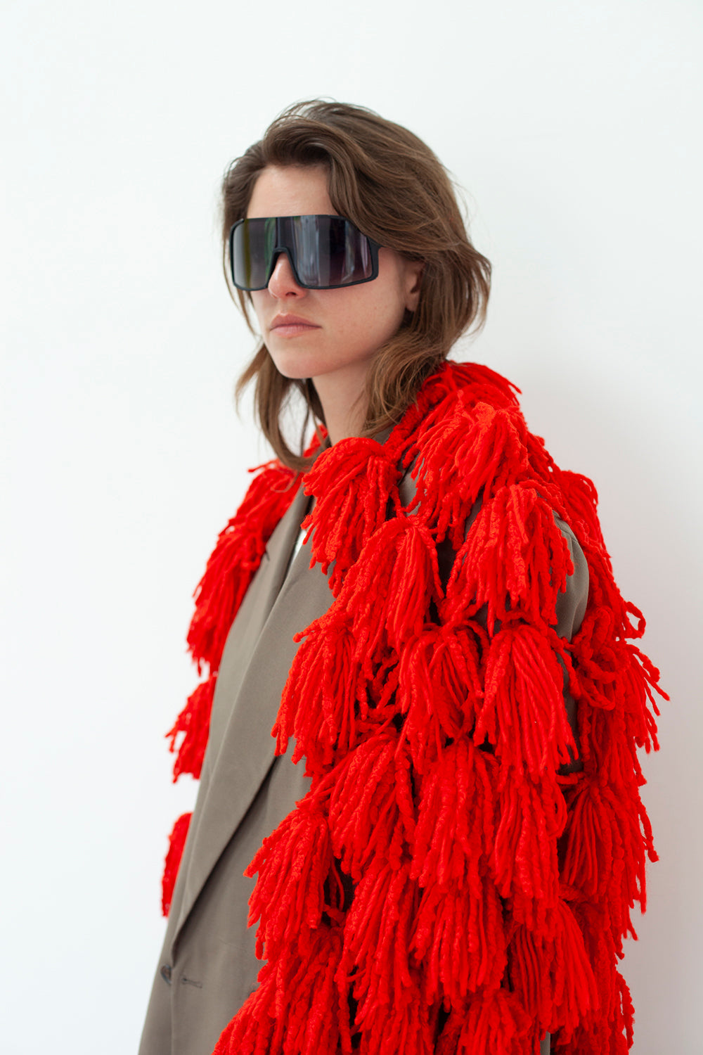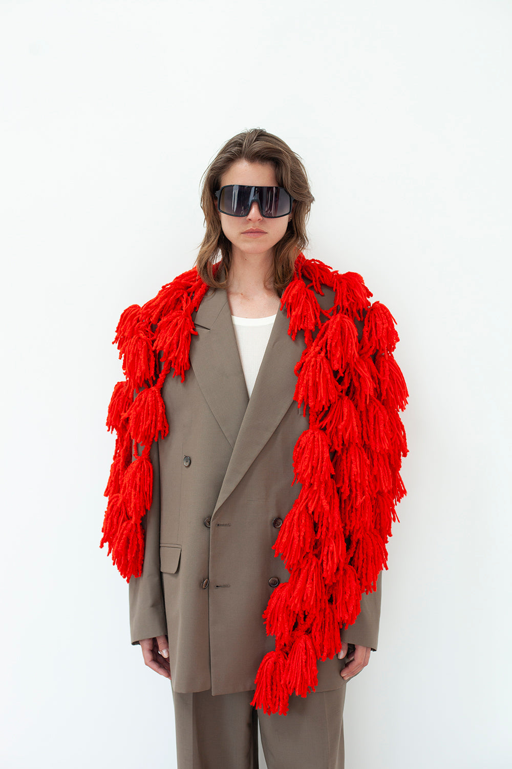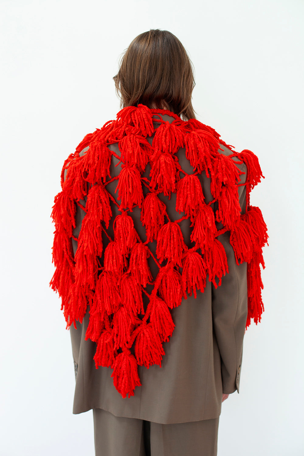 A statement of texture and movement. In cashmere, silk, and wool boucle, the Põma Põma Scarf is built on a macramé base, layered with tassel pom poms - mixing yarns in the tassels for added texture - that extend into long, dense fringing. With every movement, the scarf swings, shifts, and comes alive.