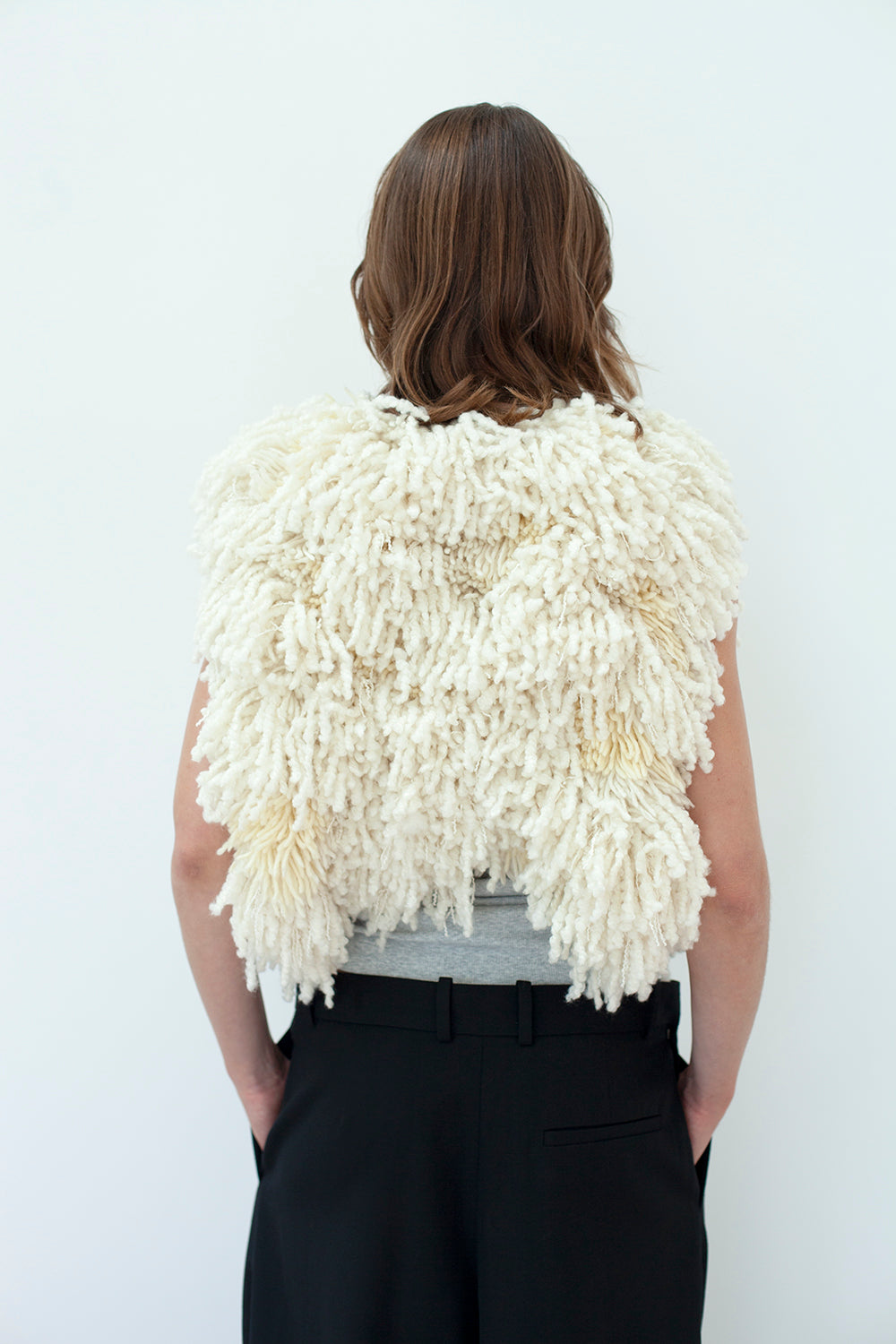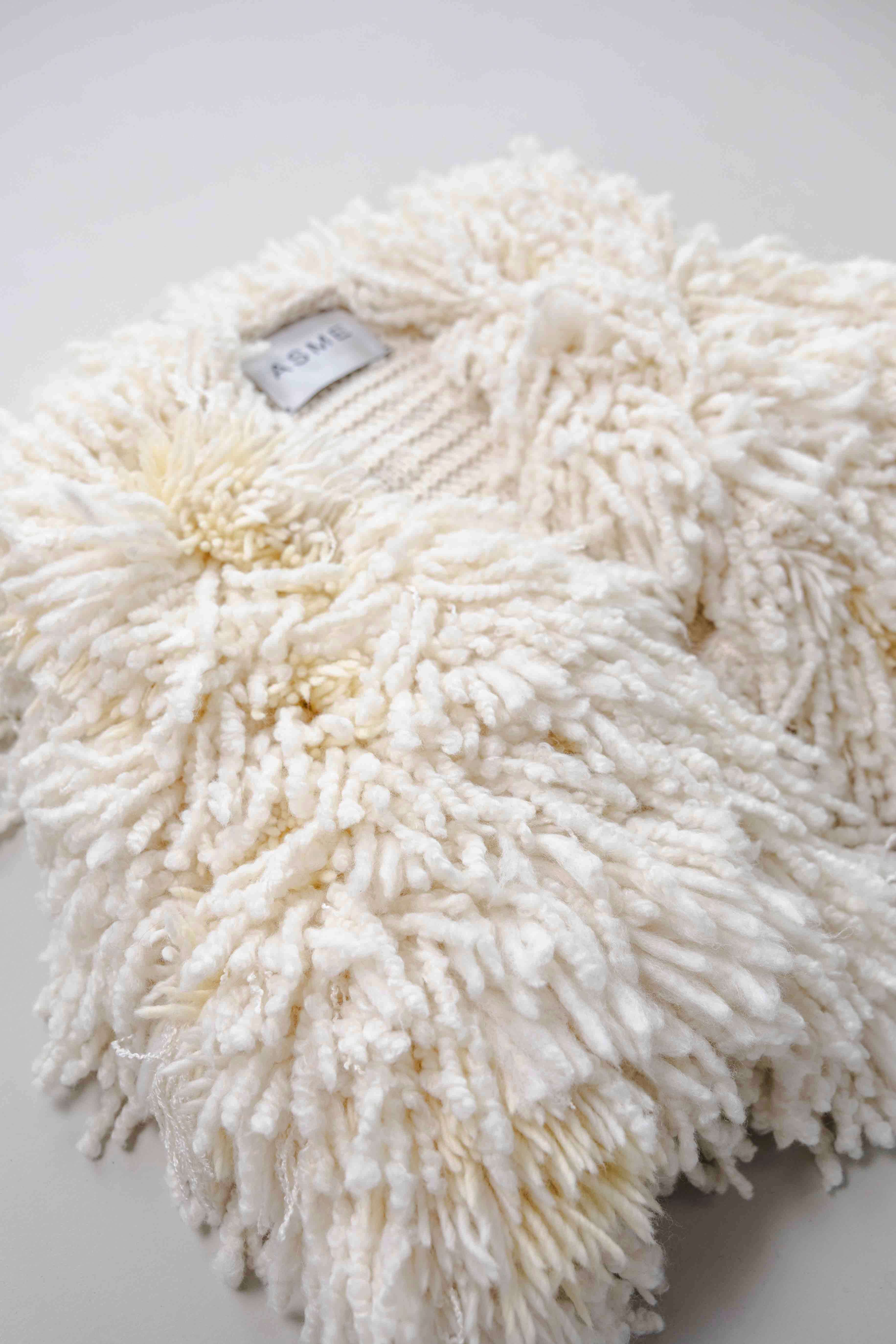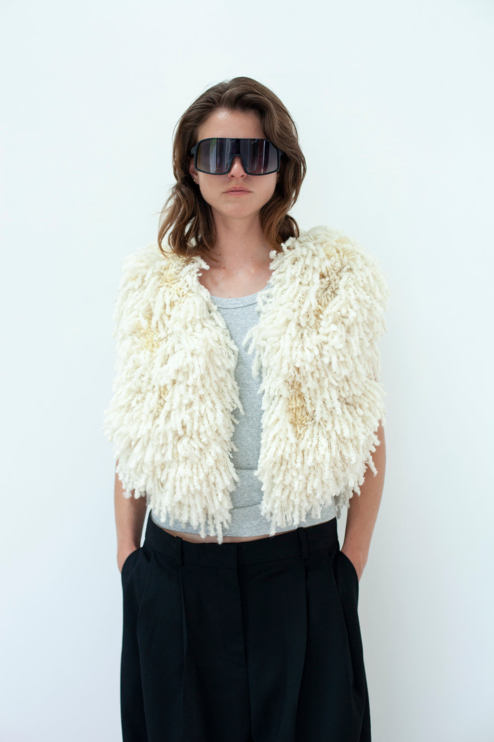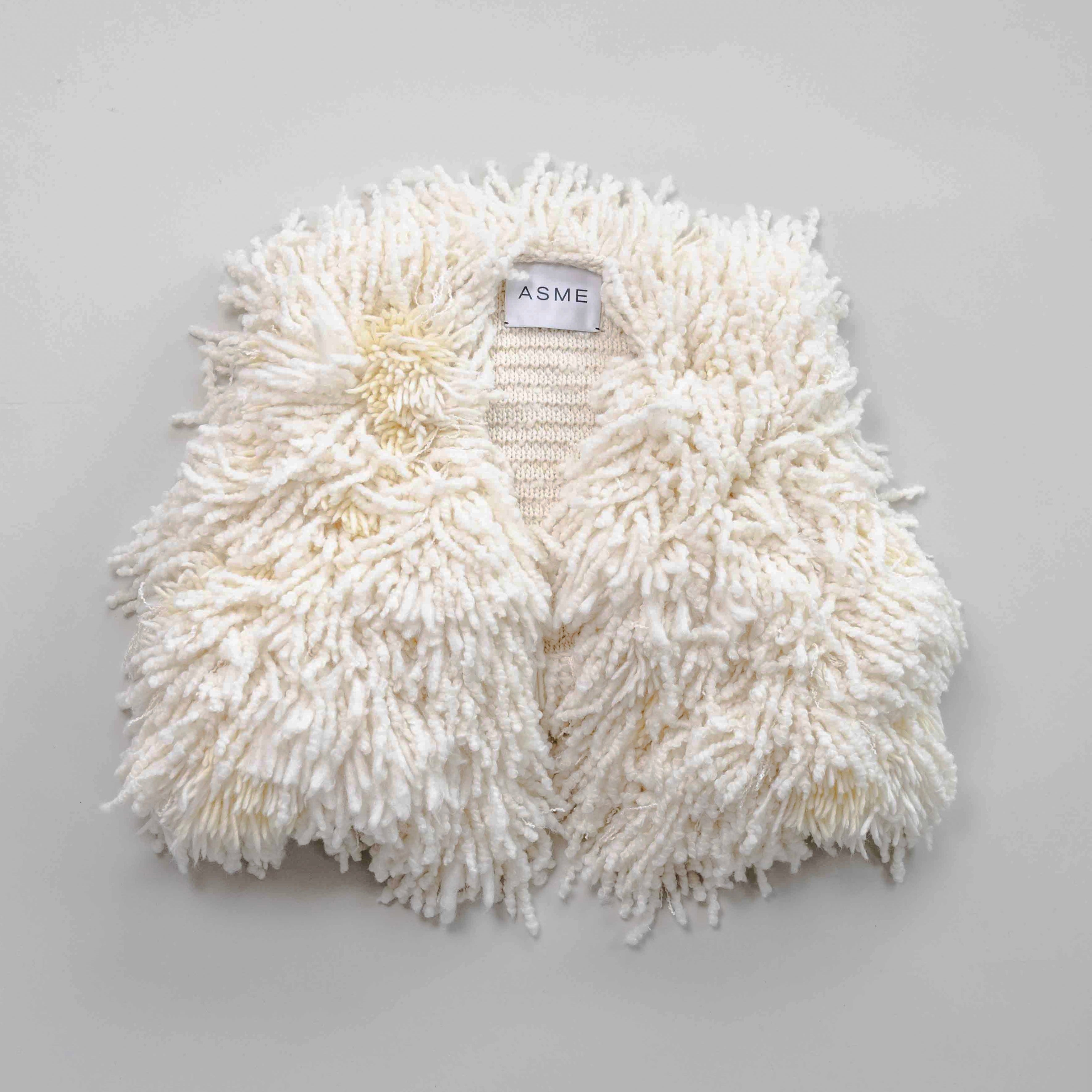 The interplay of yarns, varied in length, weight, and texture - gives the piece a sculptural drape, playful movement, and a tactile depth that feels both indulgent and light. A bold statement waistcoat, it embodies the quiet luxury that defines Asme.